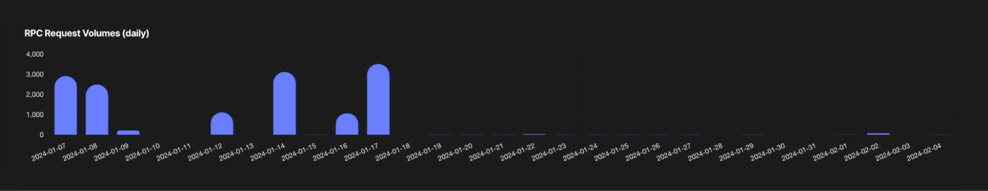 Represents the total count of remote procedure calls (RPC) made to the blockchain API for the last 30 days.